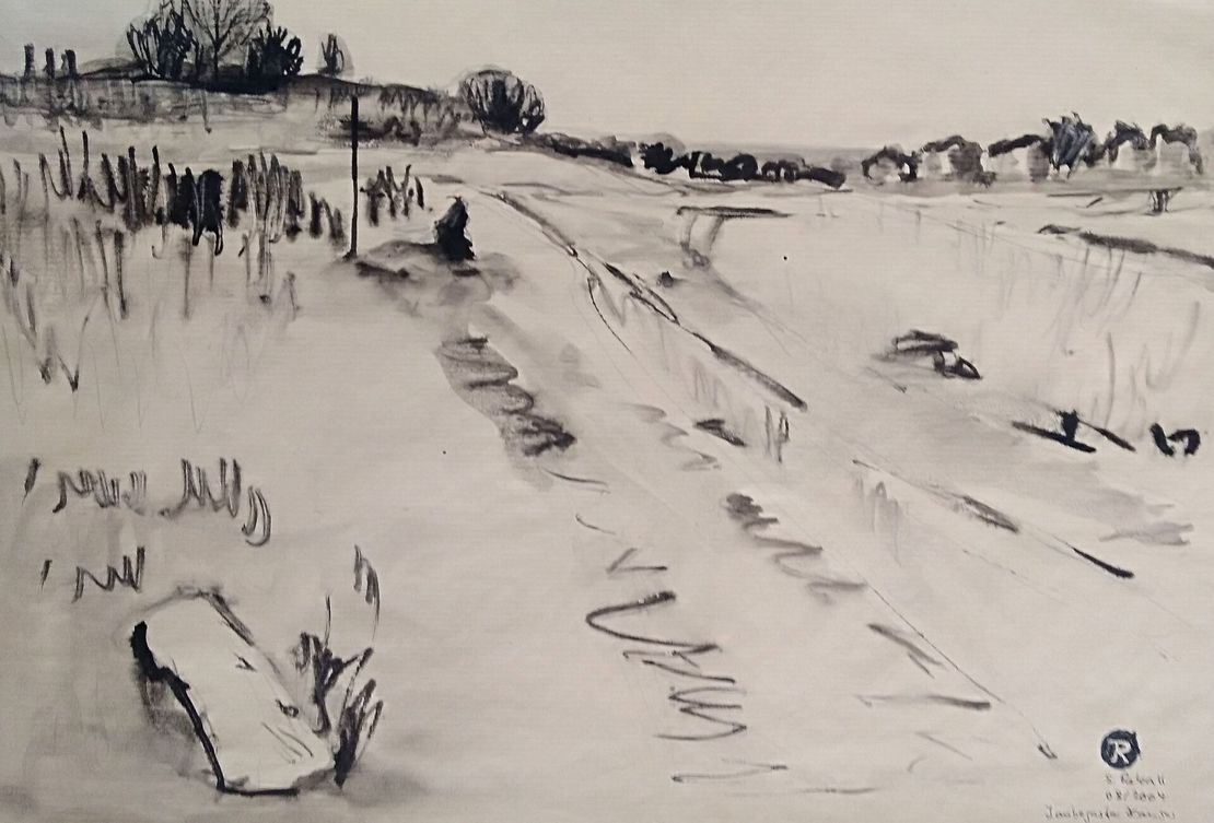 Seit 2010 wohne ich in Dresden Laubegast. Über Jahre habe ich meine Umgebung, die Streuobstwiesen, die Elbe und ihre Uferzonen in Tusche festgehalten, Im Winter folgten dann abstrakte Bilder in Acryl. Das farbige Bild oben gehört dazu: "Damals" 2013.