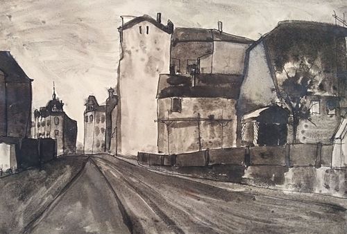 Tusche auf Chromoxydpapier. Plainairmalerei in Laubegast und anderswo: Körnerplatz und Rammenau.