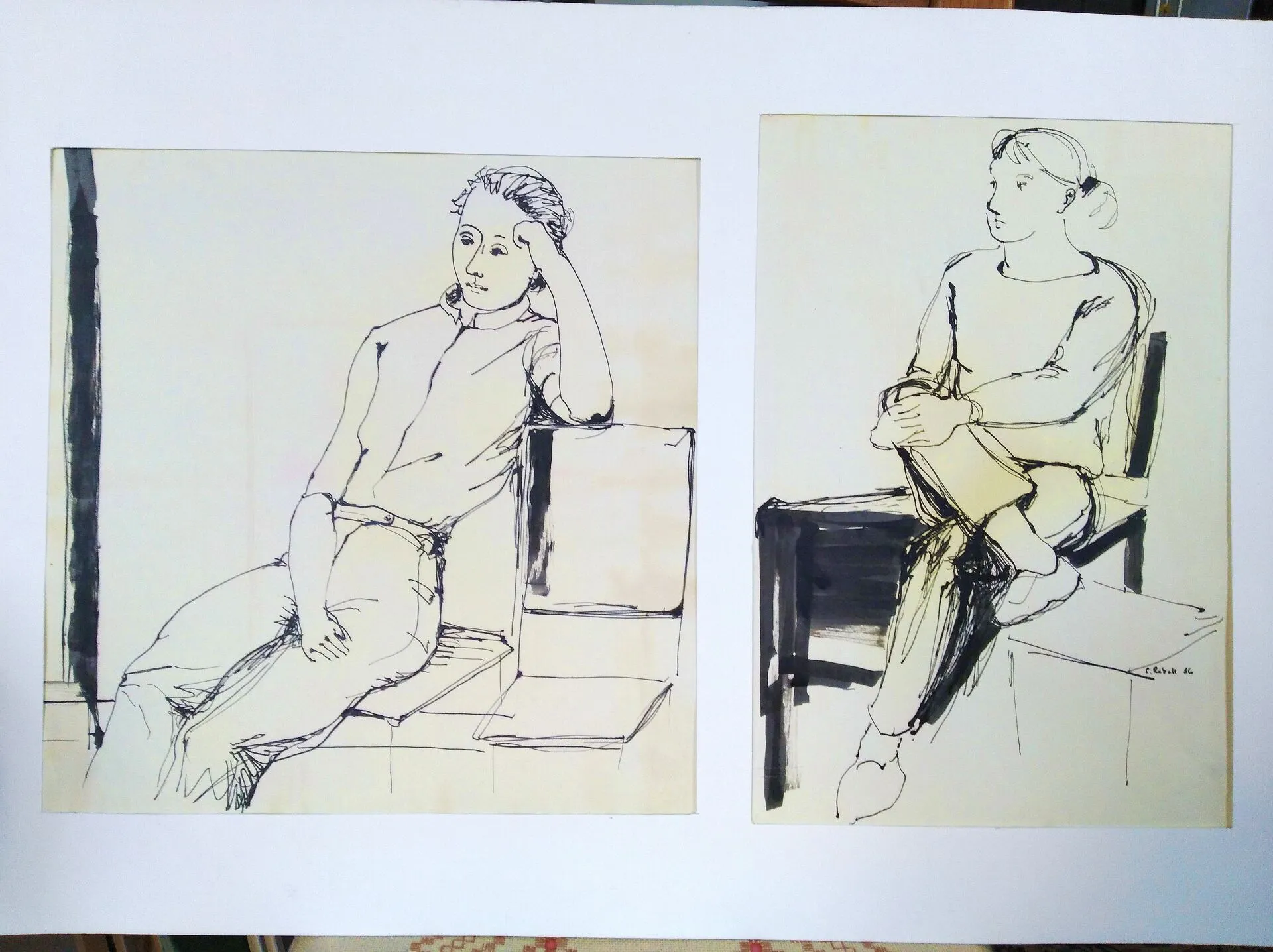 Zwei Mädchen sitzen Modell. Im Zeichenzirkel des Baukombinates Dresden, 1986